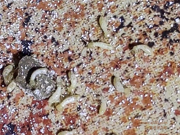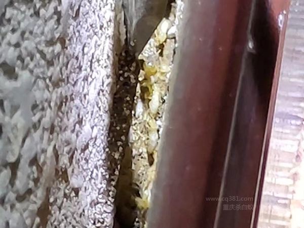 撬开被损坏栏杆后掉落出的白蚁工蚁